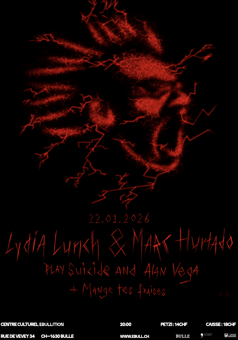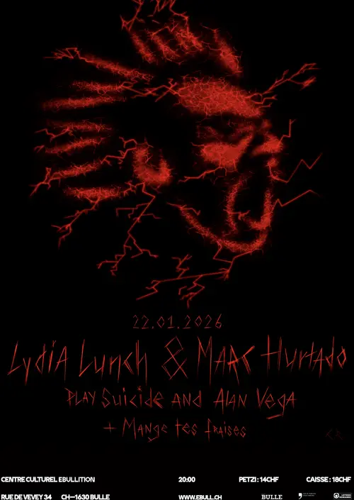 Lydia Lunch et Marc Hurtado revisitent l’héritage du duo punk new-yorkais SUICIDE (Alan Vega et Martin Rev) à travers des performances sonores et visuelles. Leur projet s'inspire de l'énergie brute du proto-punk et est décrit comme théâtral, libre et violent. https://www.youtube.com/watch?v=62ybWzzKuvQ